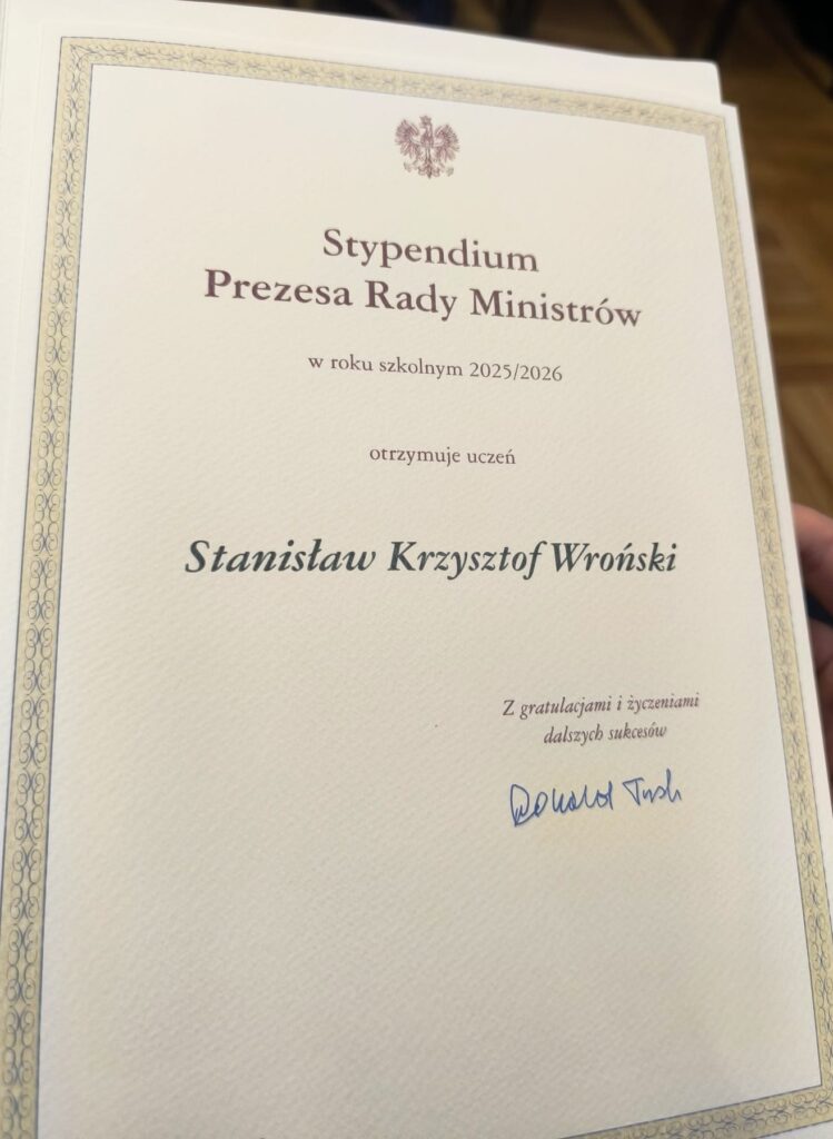 Z dumą informujemy, że Stanisław Wroński, uczeń klasy 2, otrzymał prestiżowe Stypendium Prezesa Rady Ministrów za wybitne wyniki w nauce oraz zaangażowanie w życie szkoły. To jedno z najważniejszych wyróżnień przyznawanych uczniom w Polsce. Jesteśmy ogromnie dumni z osiągnięć Stanisława. To zasłużone wyróżnienie jest dowodem na to, że ciężka praca, konsekwencja i rozwijanie swoich pasji naprawdę przynoszą efekty.